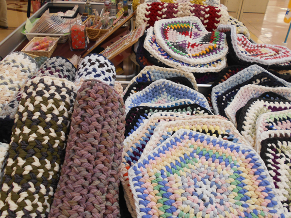 靴下の製造過程で出る輪っか状の廃材を利用してのエコな手編みのマットを作っています。
